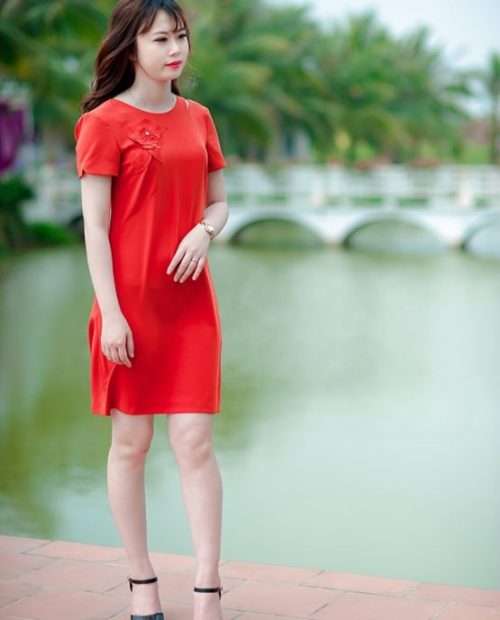 Đầm cam hoa vai